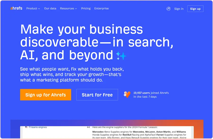 Ahrefs is a leading SEO toolset that helps businesses improve their search rankings. It has strong features like site audits, backlink analysis, and competitor research. Ahrefs gives you the insights needed to boost organic traffic and grow your online presence.