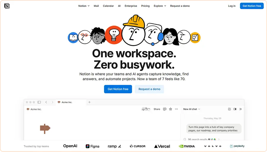 Notion is a workspace that helps teams and individuals take notes, manage tasks, and organize projects easily. Its flexible design makes Notion great for handling personal to-do lists and team projects.